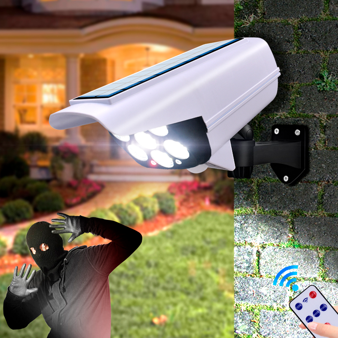 Disuade a los intrusos y agrega un toque de seguridad a tus espacios exteriores con la Luz solar con forma de cámara. Esta potente luz LED solar viene con una simulación de monitoreo y una cámara falsa para disuadir a los intrusos. Además, su sensor de movimiento de pared de inducción de cuerpo humano lo hace práctico y conveniente. Con su diseño resistente al agua IP65, es perfecto para uso en exteriores y su fácil instalación lo hace ajustable para el ángulo de iluminación óptimo y el ángulo del panel solar.