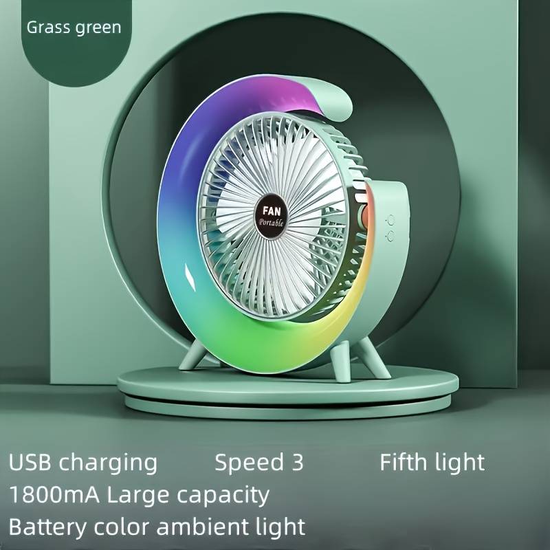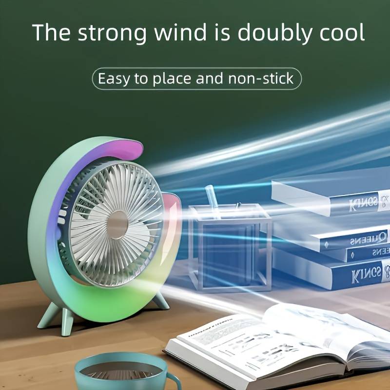 Mantén tu espacio fresco y vibrante con el Ventilador de Escritorio Multicolor con Luz. Este ventilador eléctrico compacto y silencioso no solo proporciona una brisa refrescante, sino que también ilumina tu entorno con una gama de colores RGB ajustables. Perfecto para el hogar o la oficina, su diseño inteligente y recargable por USB lo hace práctico y eficiente para cualquier ambiente.